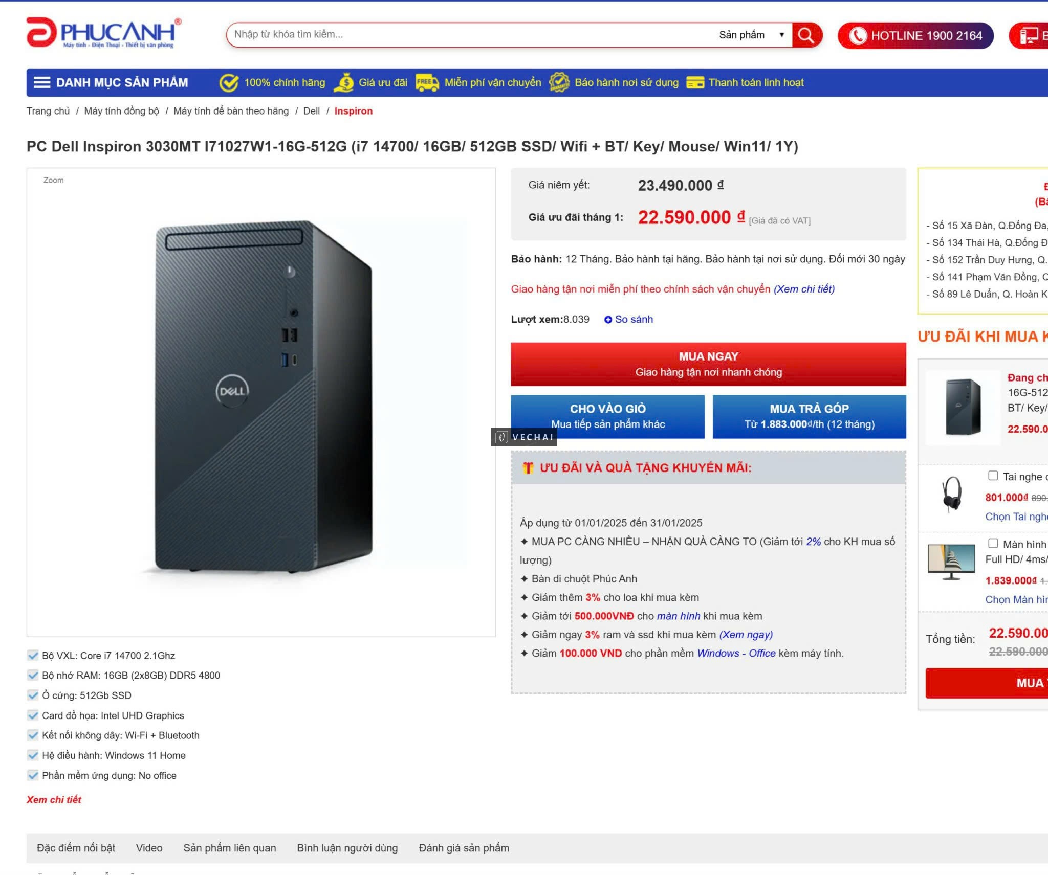 PC Dell Inspiron 3030 Core I7 14700/ 16GB/ 512GB SSD/ Wifi + BT/ Key/ Mouse/ Win11/ 1Y – Hàng chính