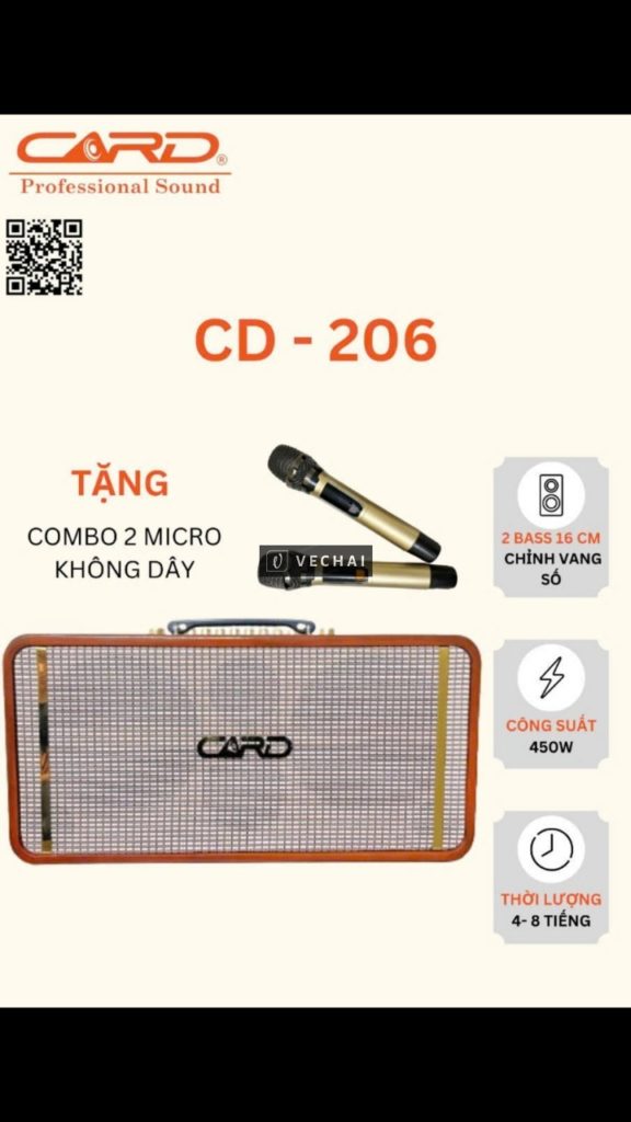 CD-206 – dàn Karaoke di động với Chất âm tuyệt hảo – Kiểu dáng quý phái. Công suất 450W cho âm trầm mạnh mẽ. Với khả năng tích hợp hàng chục ngàn bài hát chất lượng cao online và offline, hiển thị karaoke trên bảng LED, điều khiển và chọn bài hát trên smartphone, tablet, Smart tivi, Laptop… tương thích hầu hết quy định ký gởi hành lý của các hãng hàng không, rất thích hợp với các chuyến đi dã ngoại, du lịch, học trực tuyến, sinh nhật, tiệc vui gia đình…CD-206 là sự lựa chọn tuyệt vời cho mọi khách hàng.